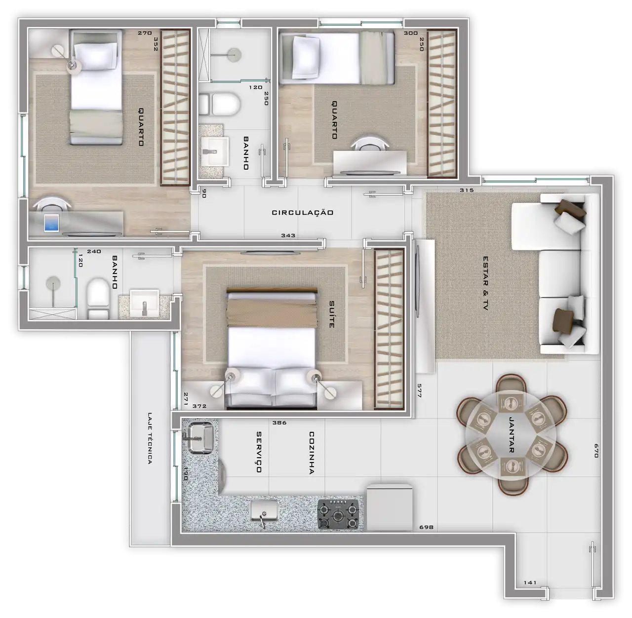 Área total de 74,05m² e 74,05m² de área útil.