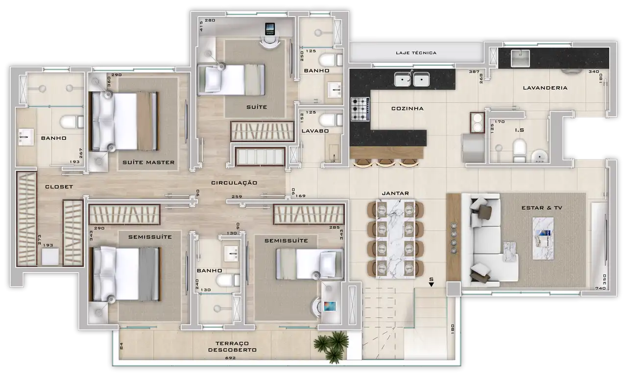 O imóvel tem 4 quartos, sendo 2 suítes, e 3 vagas de garagem.
